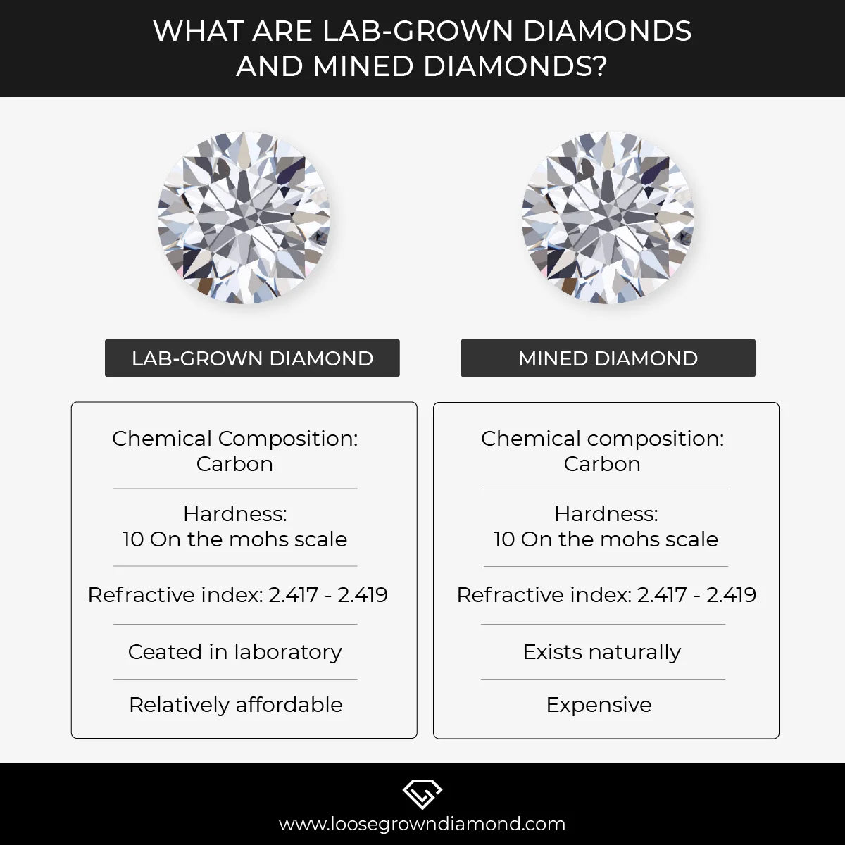 Lab-grown diamonds have the same physical, chemical, and optical properties as natural diamonds. To the naked eye, they look exactly the same. They are also certified by the same leading gemological institutes that certify natural diamonds.
